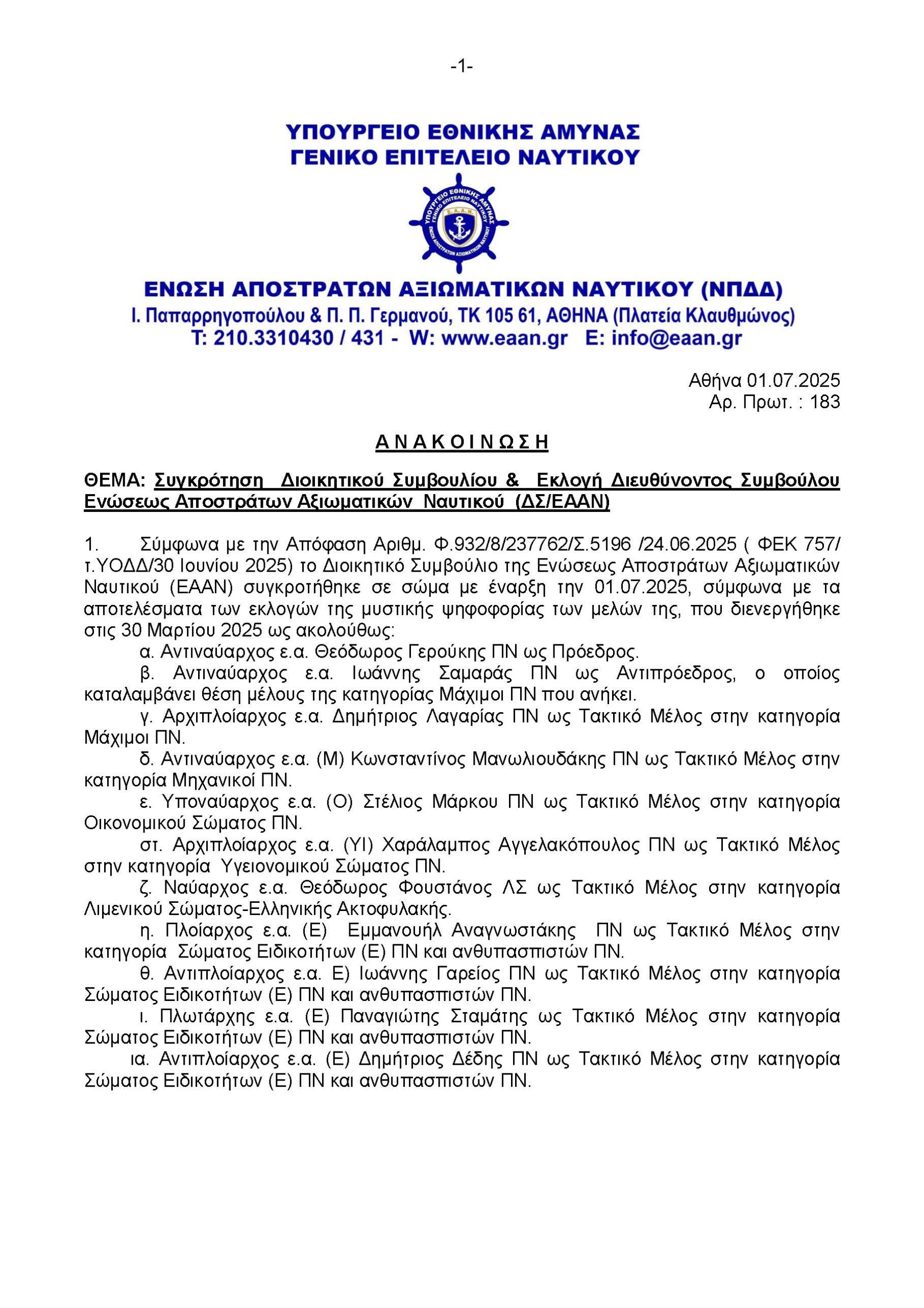 Συγκρότηση ΔΣ & Εκλογή Διευθ. Συμβούλου Ενώσεως Αποστράτων Αξιωματικών Ναυτικού ** ***Δείτε την ανακοίνωση σε pdf