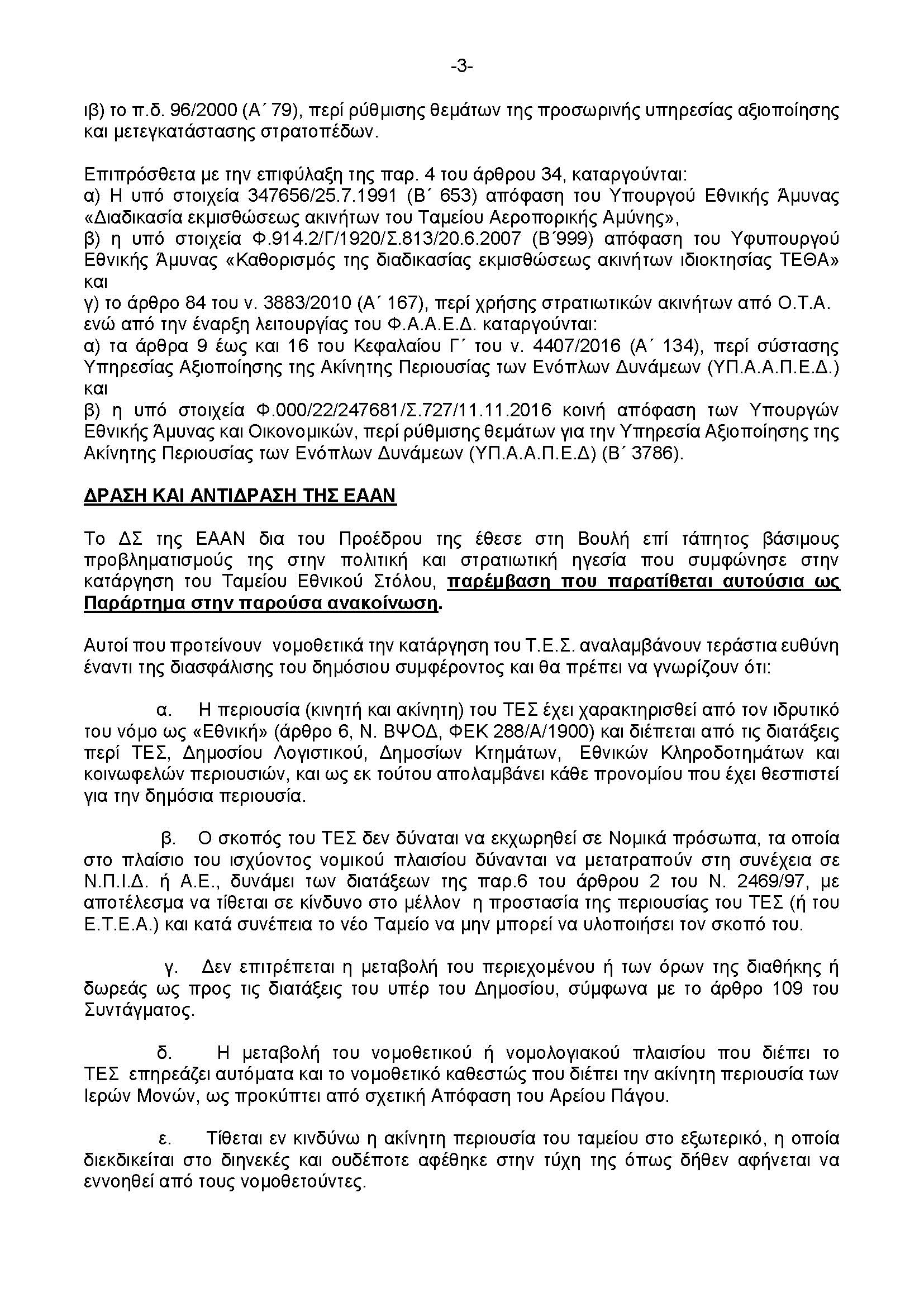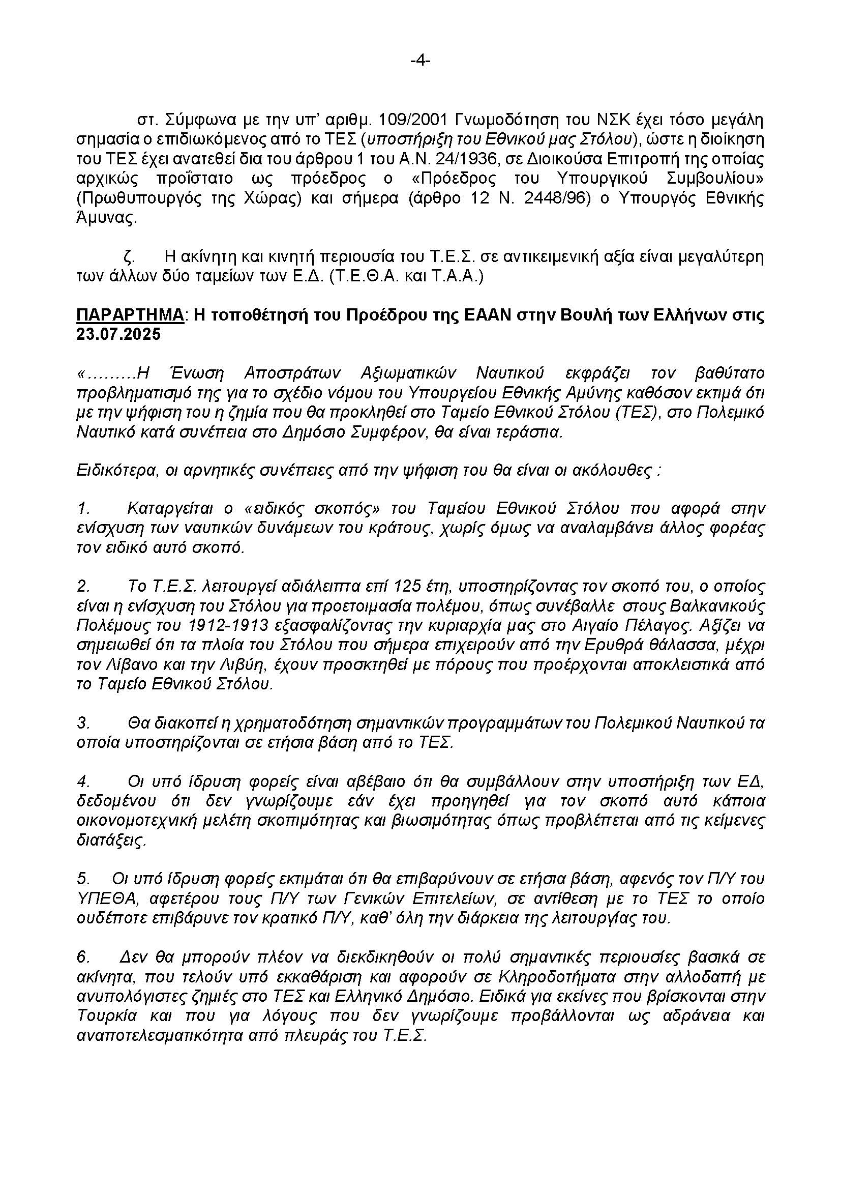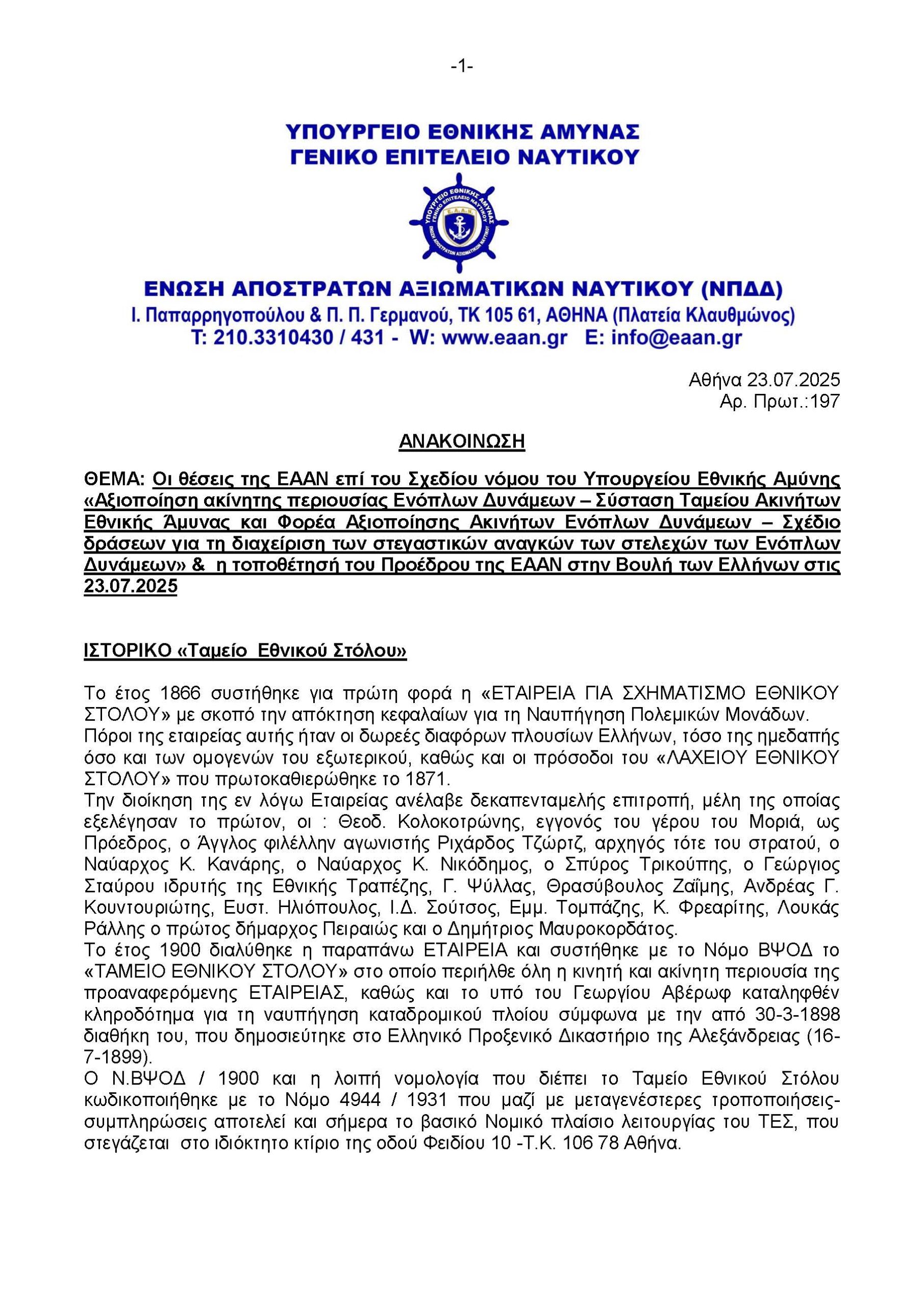 Οι θέσεις της ΕΑΑΝ επί του Σχ. Νόμου του ΥΠΕΘΑ (ΥΠΟΜΝΗΜΑ Προέδρου ΕΑΑΝ) 23.7.25*** Δείτε την ομιλία του Προέδρου της ΕΑΑΝ, Αντιναύαρχου εα Θ. Γερούκη ΠΝ, στη Βουλή των Ελλήνων