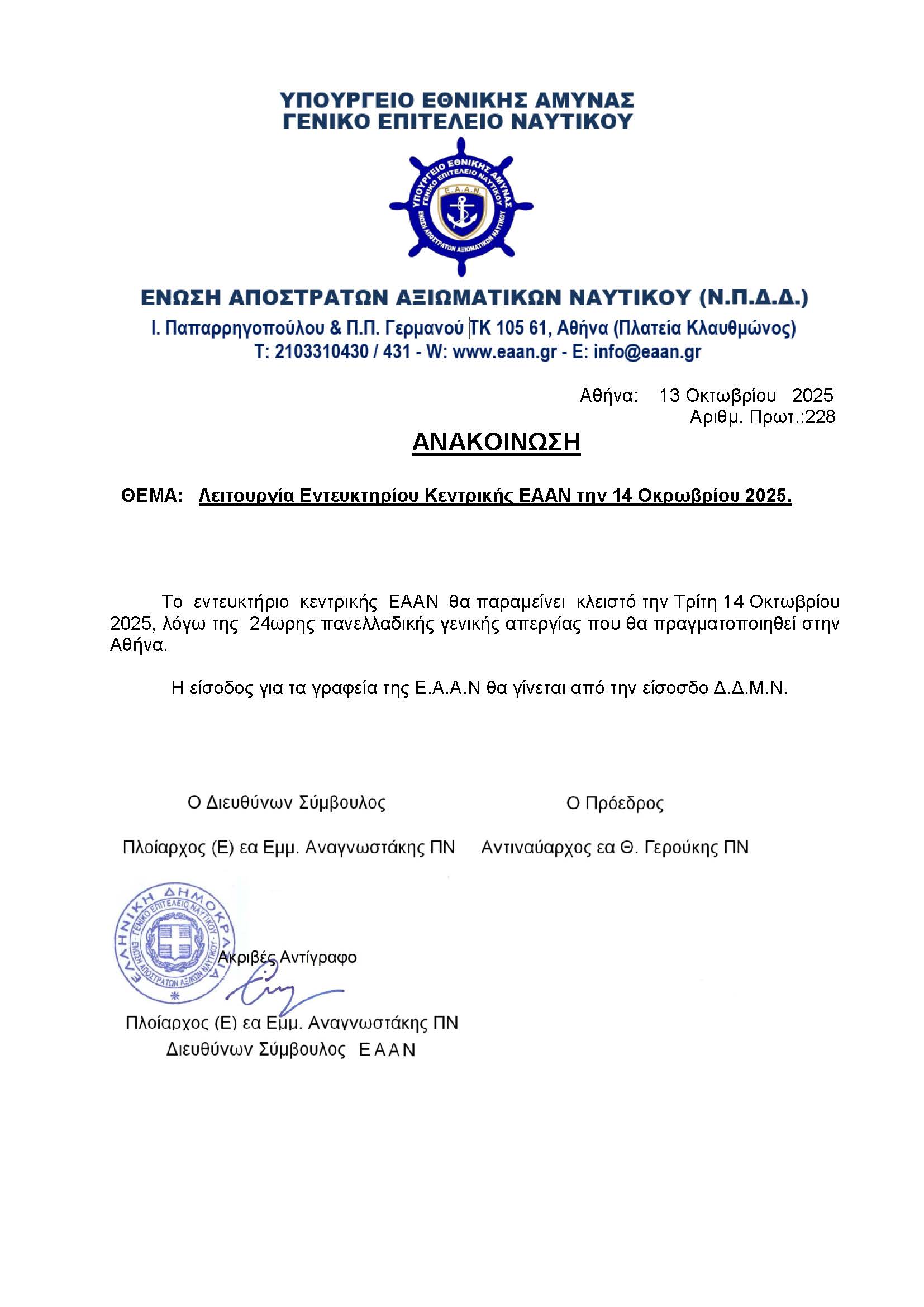 Λειτουργία Εντευκτηρίου Κεντρικής ΕΑΑΝ την 14η Οκτωβρίου 2025