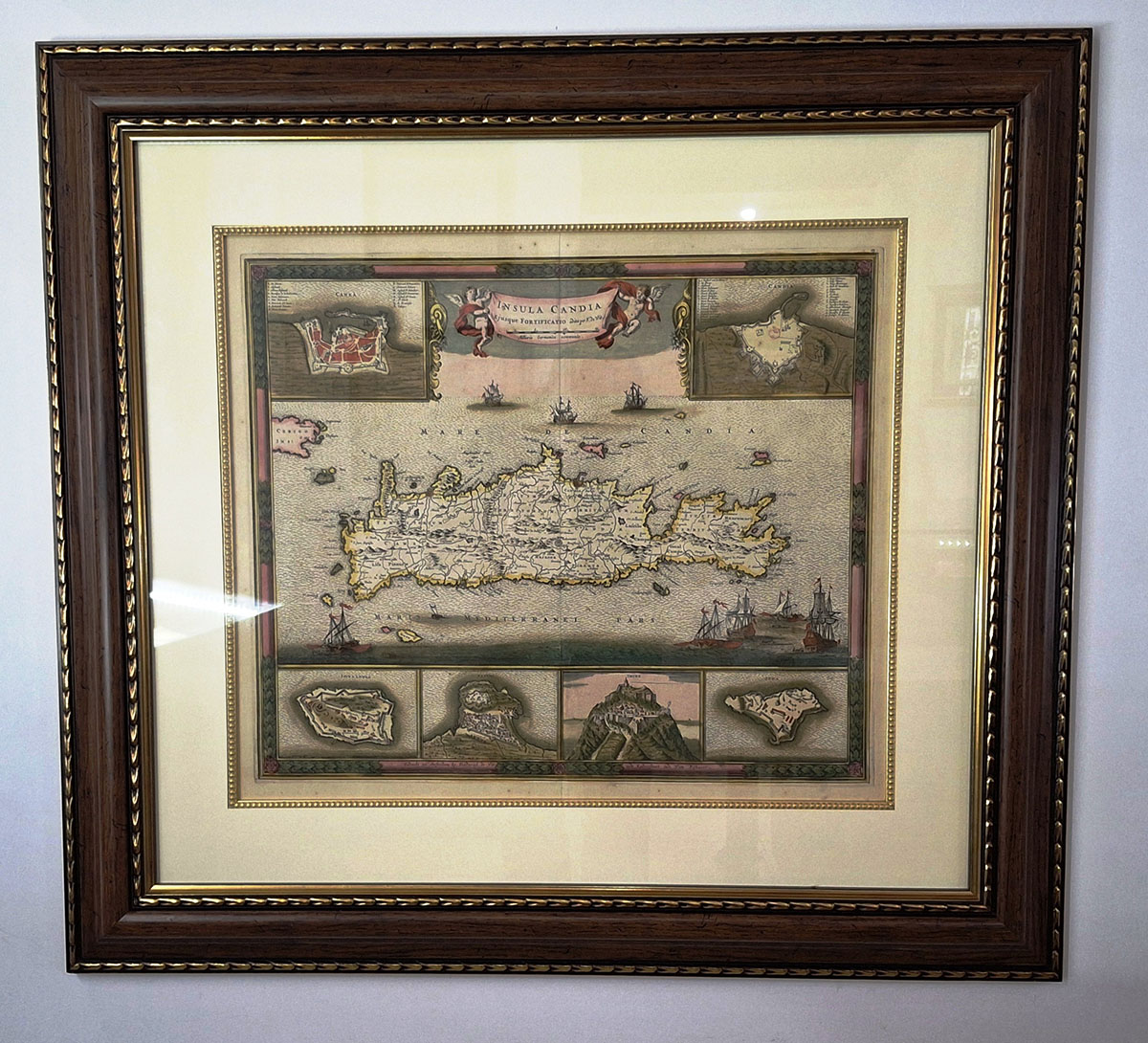 Στο κέντρο της συλλογής δεσπόζουν μια χρωματισμένη χαλκογραφία του Ολλανδού χαρτογράφου Frederik De Wit (1634-1706), Η Νήσος Κρήτη και οι οχυρώσεις της “Insula Candia ejusque fortification” από το βιβλίο De Wit, Frederik, Atlas sive descriptio terrarum orbis, Άμστερνταμ, π. 1680 και μια χαλκογραφία του Γερμανού χαρτογράφου Matthäus Seutter (1678-1757), Το νησί της Κρήτης χωρισμένo σε τέσσερα μέρη και άποψη του Ηρακλείου “Candia” από το βιβλίο Seutter, Matthäus, Atlas novus, sive Tabula Geographicae Totius Orbis, Άουγκσμπουργκ, μετά το 1744. Οι χάρτες μεγάλων διαστάσεων ολοκληρώνονται με τη χαλκογραφία του Φλαμανδού χαρτογράφου και γεωγράφου Abraham Ortelius (1527-1598), Η Κρήτη, το νησί του μεγάλου Δία, βρίσκεται στο μέσο της θάλασσας “Creta, Iovis magni medio jacet insula ponto” από το βιβλίο Ortelius, Abraham, Theatrum Orbis Terrarum, Αμβέρσα, 1584 και μια ανεξάρτητη χαλκογραφία του Henri Scheurleer, Turkey in Greece “Turquie en Europe”.