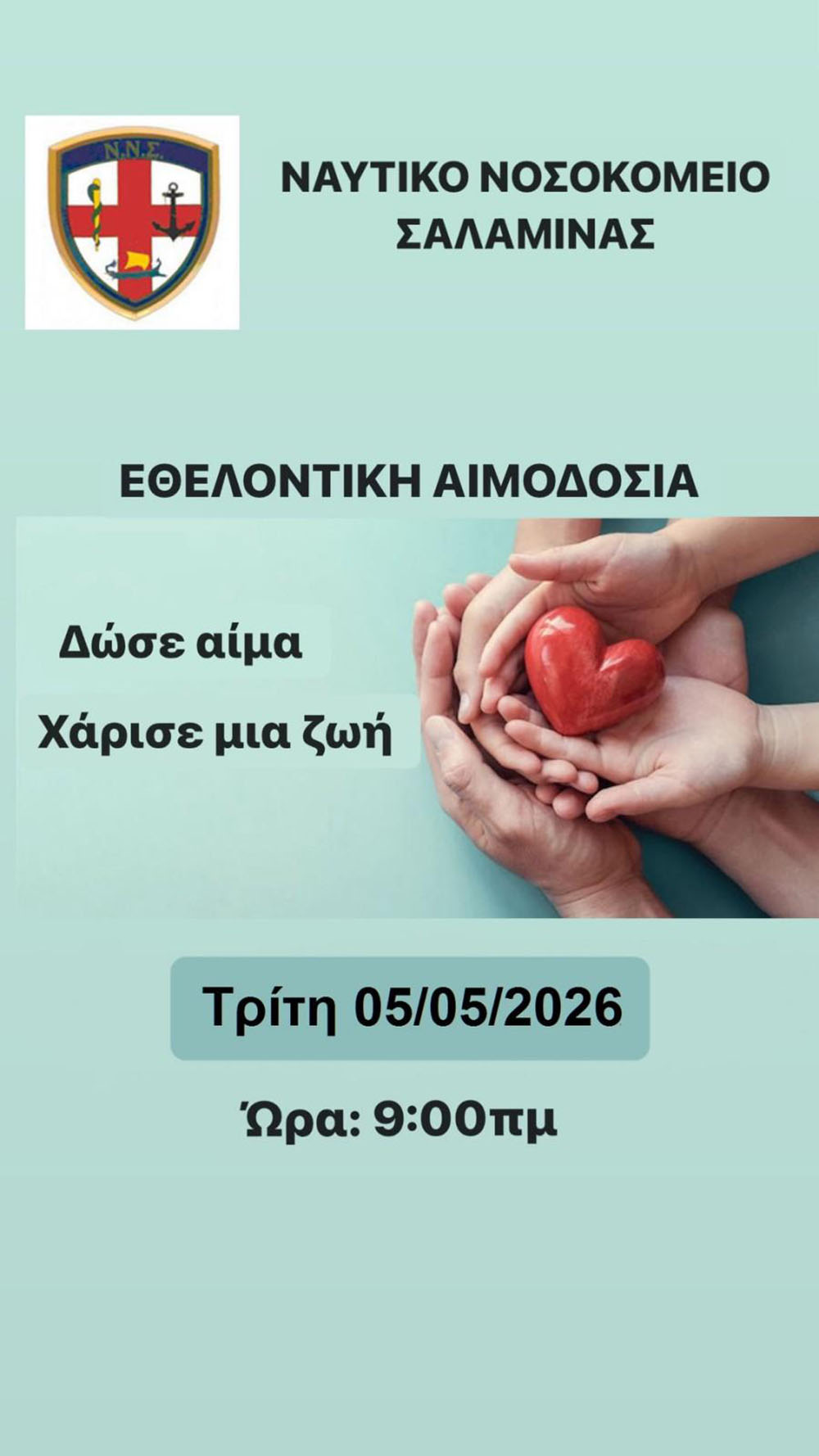 Γνωρίζεται ότι την Τρίτη 5 Μαΐου 2026 και από ώρας 09:00 θα εκτελεστεί εθελοντική αιμοδοσία στο ΝΣ/ΝΝΣ από αρμόδια κινητή μονάδα αιμοδοσίας του ΝΝΑ.