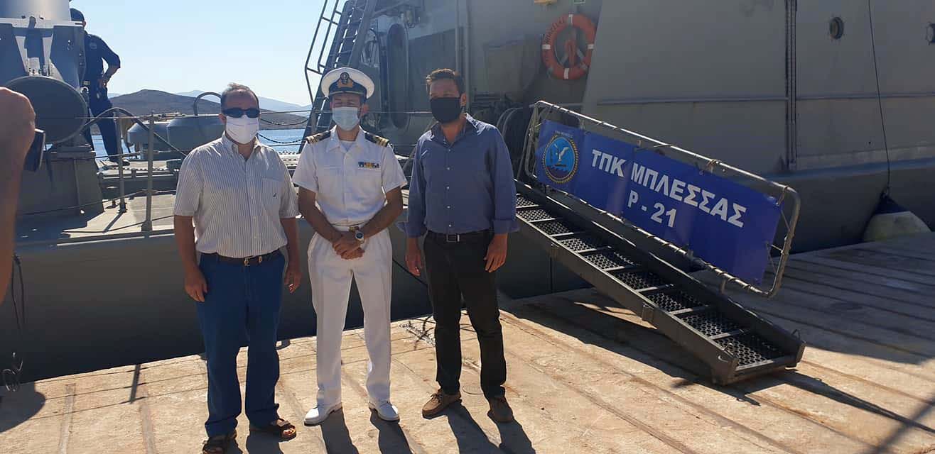 Στη συνέχεια, ο Δήμαρχος Χάλκης, κος Άγγελος Φραγκάκης, ο Αντιδήμαρχος Χάλκης, κος Βασίλειος Ρουσσάκης (γαμπρός του αείμνηστου Ναυάρχου ΠΝ Περίανδρου Λαμπίρη) και ο Τοπικός Εκπρόσωπος ΕΑΑΝ Χάλκης & εγγύς νήσων, Πλοίαρχος εα ΠΝ Ιωάννης Ασπροποταμίτης επισκέφθηκαν την ΤΠΚ ΜΠΛΕΣΣΑΣ για ανταλλαγή ευχών με το πλήρωμα του πλοίου. Προσφέρθηκαν παραδοσιακά προϊόντα του νησιού και φρέσκα ψάρια (αλιευμένα από το παρακείμενο αλιευτικό ΑΓ. ΝΙΚΟΛΑΟΣ νηολογίου Καλύμνου, με πλήρωμα μέλη της οικογένειας του Καλύμνιου Καπετάνιου Σταύρου Μιχαήλου, ο οποίος τους θερινούς μήνες αλιεύει στον θαλάσσιο χώρο της Νήσου Χάλκης και του Καρπάθιου Πελάγους).