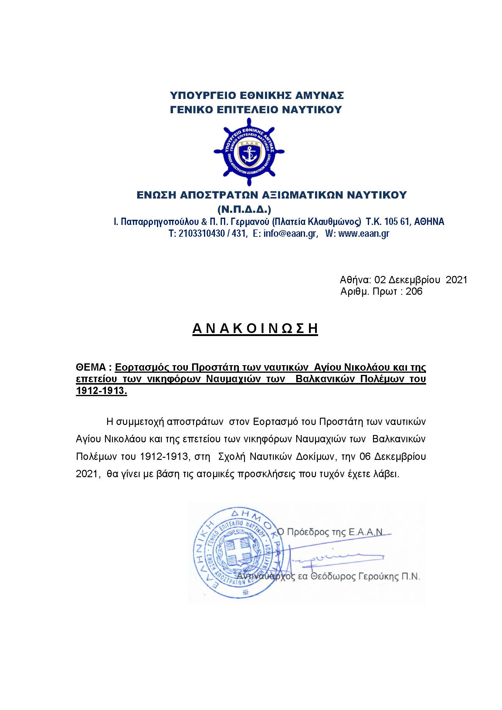 Εκδήλωση Εορτασμού Αγ. Νικολάου & Νικηφόρων Ναυμαχιών Βαλκανικών Πολέμων στη ΣΝΔ