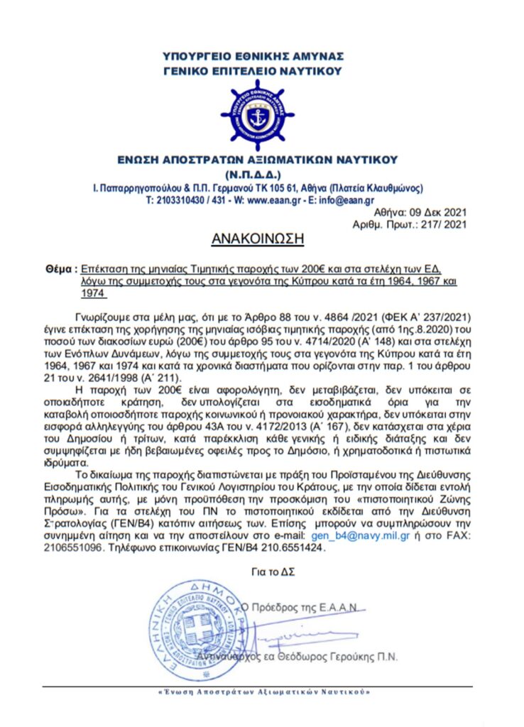 Επέκταση μηνιαίας Τιμητικής παροχής των 200 € και στα στελέχη των ΕΔ, λόγω συμμετοχής στα γεγονότα της Κύπρου τα έτη 1964, 67 και 74 (Ορθή Επανάληψη με Αίτηση) *** Δείτε την Αίτηση χορήγησης Βεβαίωσης