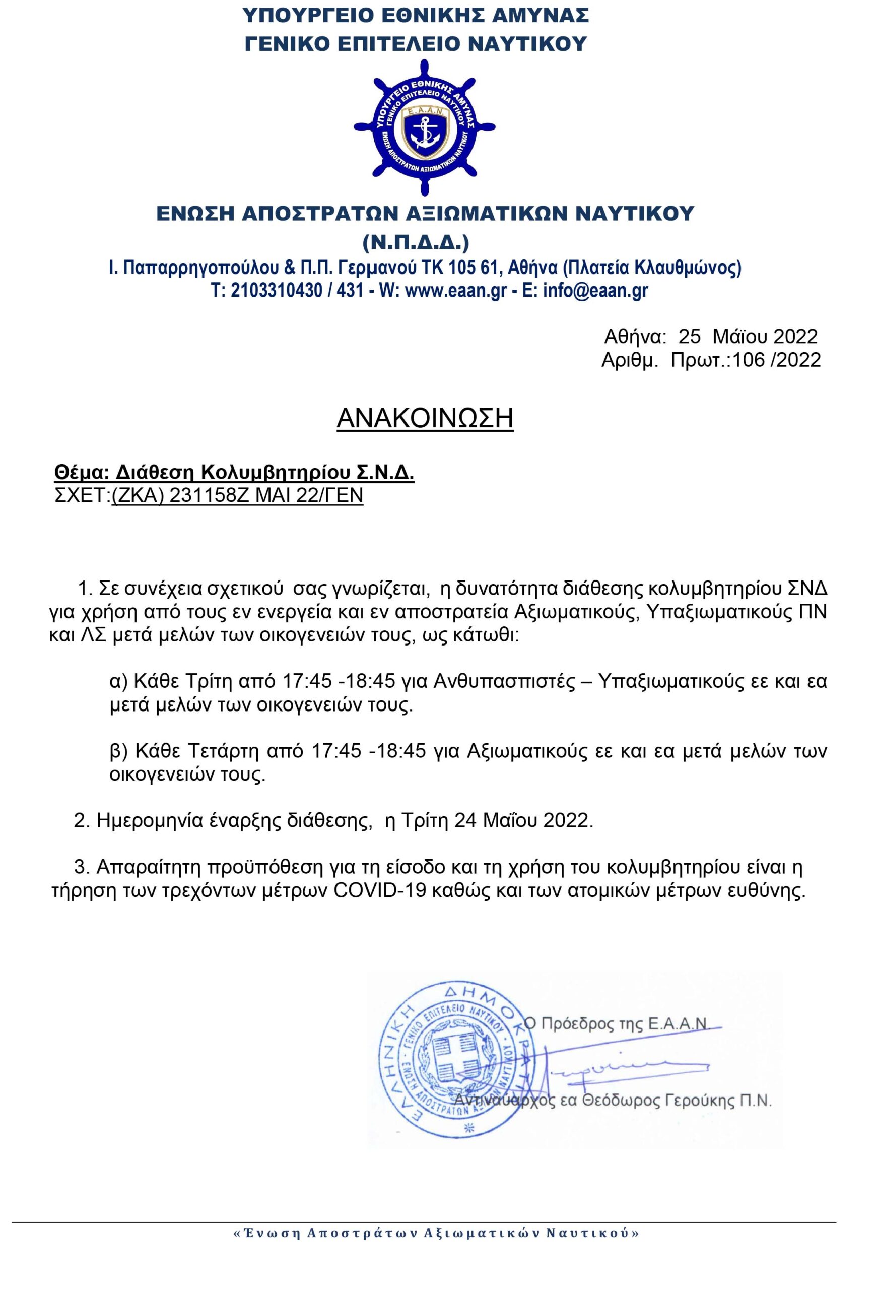 Διάθεση Κολυμβητηρίου Σ.Ν.Δ.
