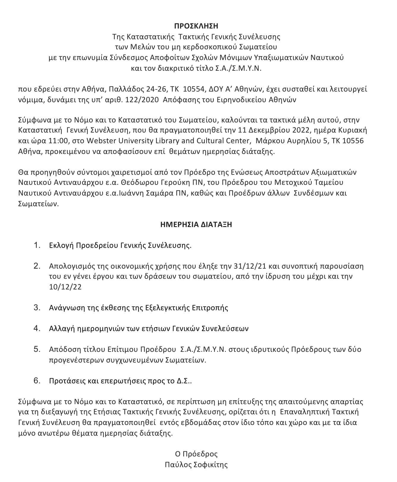 ΣΑ/ΣΜΥΝ Πρόσκληση Τακτικών Μελών στην Καταστατική Γενική Συνέλευση (11.12.22)