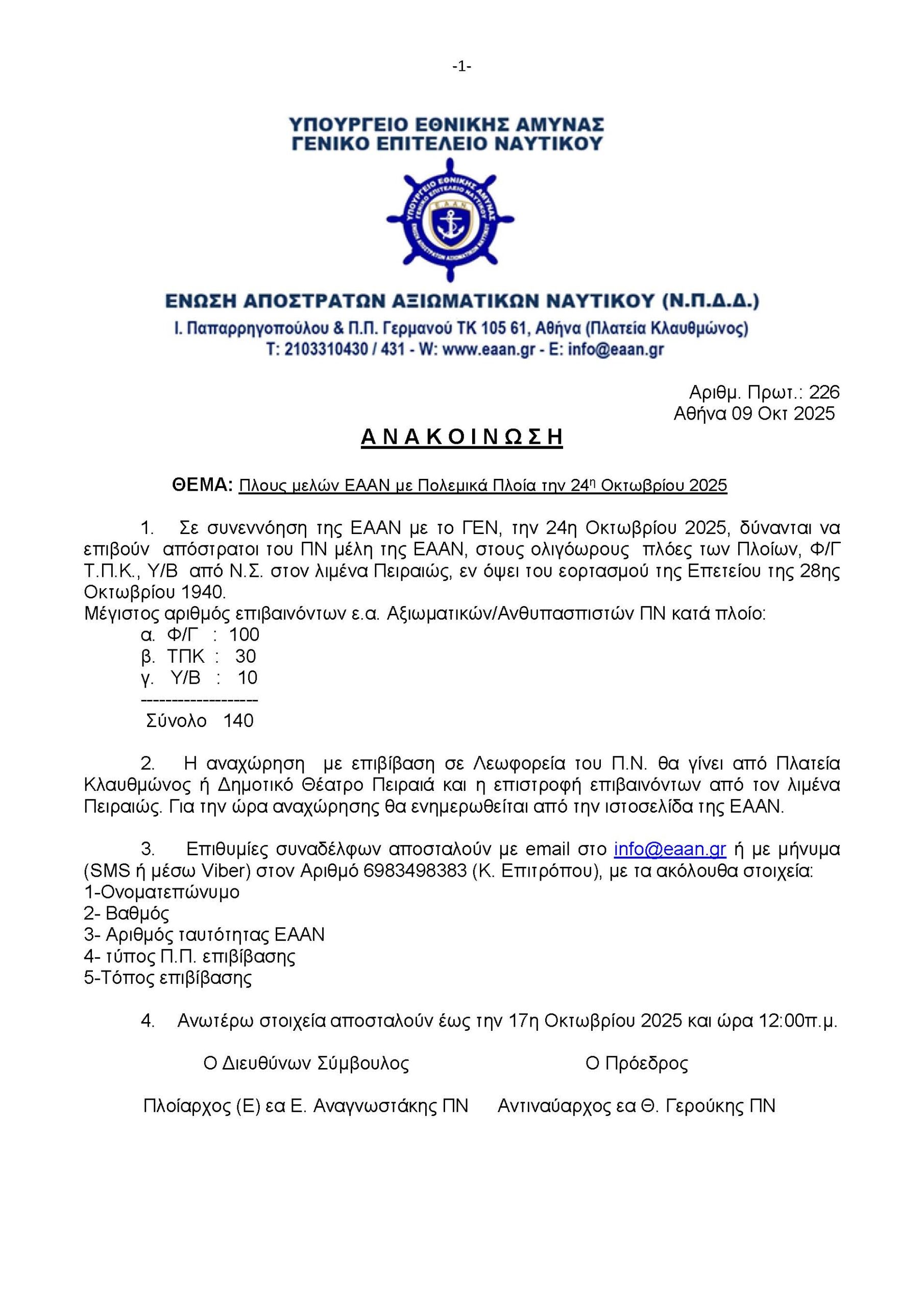 Πλους Μελών ΕΑΑΝ με Πολεμικά Πλοία την 24η Οκτωβρίου 2025